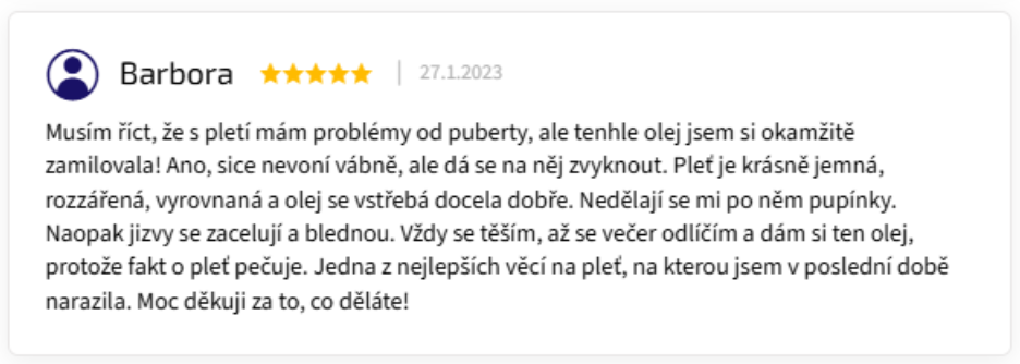 - Ricinový olej – má hustou gelovou texturu, která pomáhá zjizvenou tkáň hydratovat. Ze zpětné vazby víme, že se osvědčuje nejen na akné jizvy, ale také na pooperační a starší jizvy.